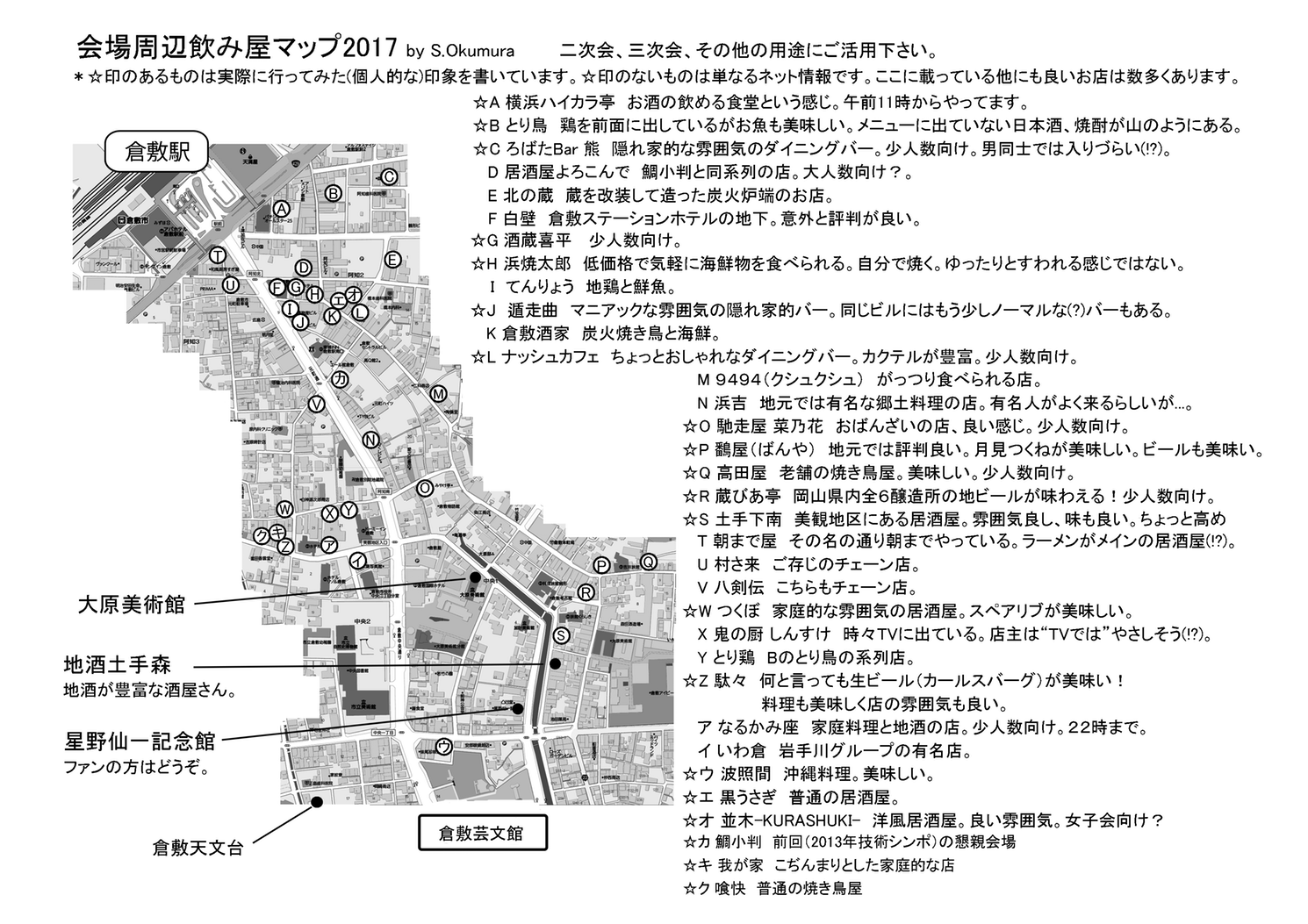 | 12月21日(木) | 天文学に関する技術シンポジウム 懇親会 会場: 倉敷 鳥焼酒房 鷭屋(ばんや) - 倉敷美観地区近くにあります。 徒歩移動可。(こちらの地図の"P"のお店です。) 参加費:4,500円程度 時間:18:30~ (予定)